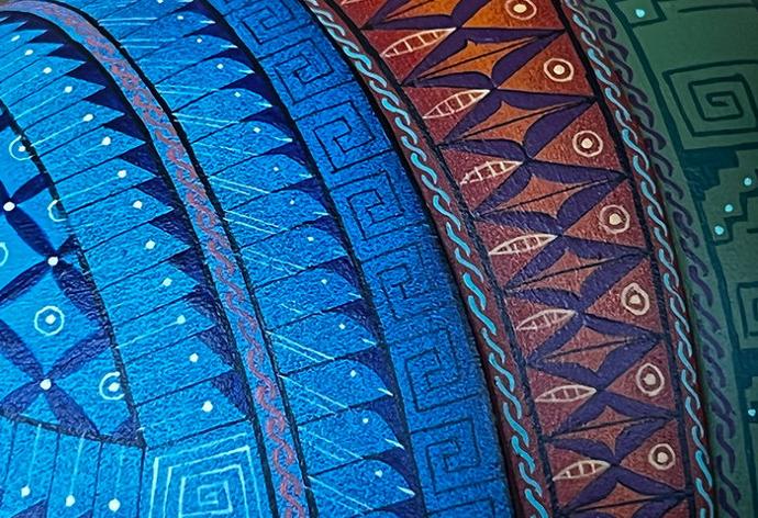 Los símbolos que se encuentran pintados en la pieza, son trazos encontrados en zonas arqueológicas de Oaxaca donde habitaron pueblos milenarios cuyas creencias tenían profunda relación con el cosmos y la vida terrenal.